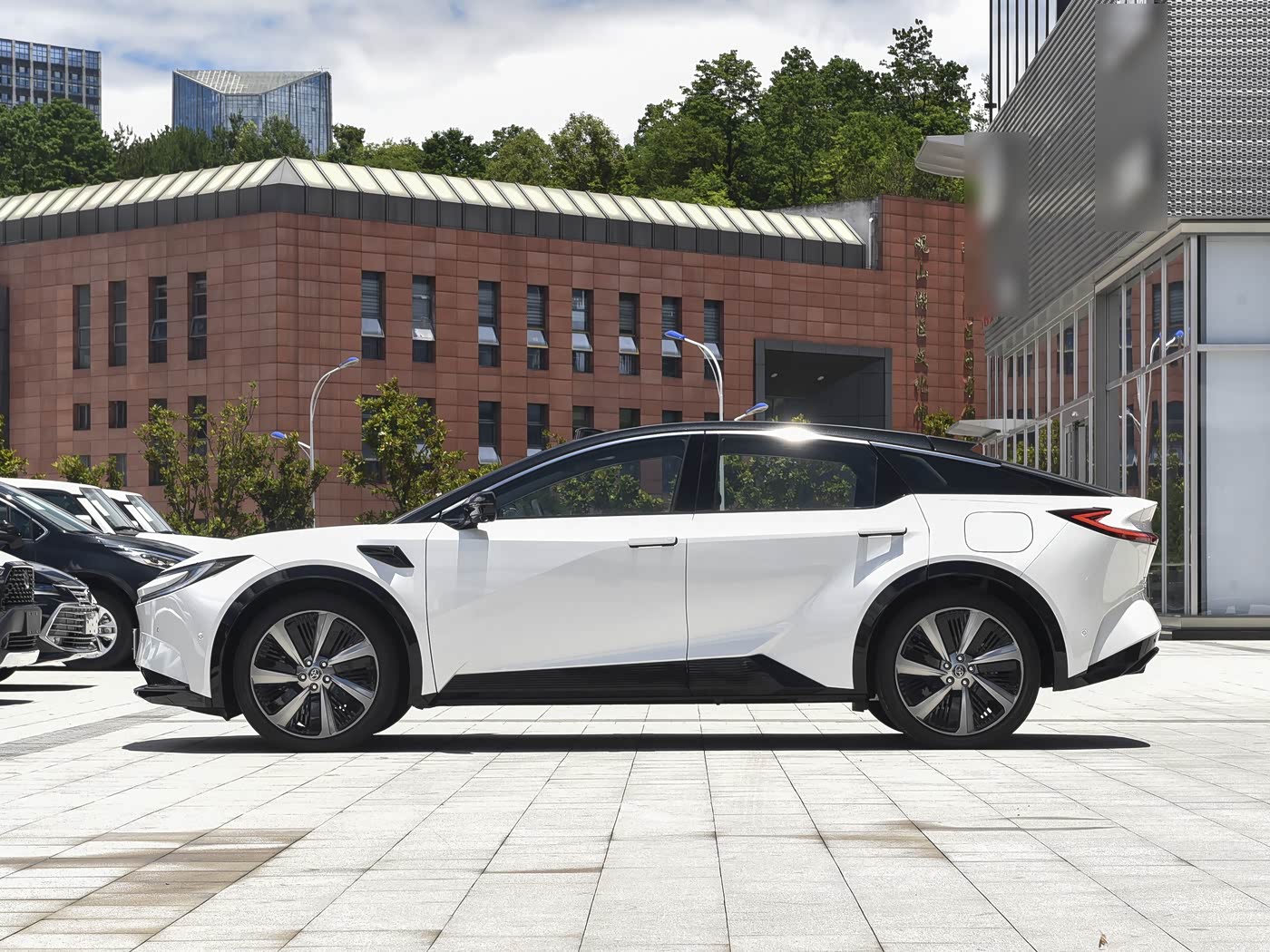 再来看车身侧面部分,bZ5基于e-TNGA纯电架构打造,车身尺寸为4780×1866×1510mm,轴距达2880mm,超1.9米的车宽搭配仅1.51米的车高,形成宽体低趴姿态,比同价位车型宽出近10厘米。溜背式车顶线条从B柱平滑延伸至车尾,搭配隐藏式电动门把手和19英寸旋风轮毂,运动感拉满却不张扬。车身侧面采用双腰线设计,前腰线贯穿前后门把手,后腰线在尾部形成上扬趋势,搭配黑色轮眉和侧裙,进一步强化了整车的运动气息。